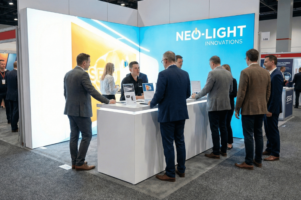 1小間の最大の武器は「背面の壁(幅3m)」です。ここに細々としたパネルを貼るのではなく、「SEGO Light Box 300×250」のような内照式のシステムを使い、壁全体を光る1枚のグラフィックにしてしまいます。